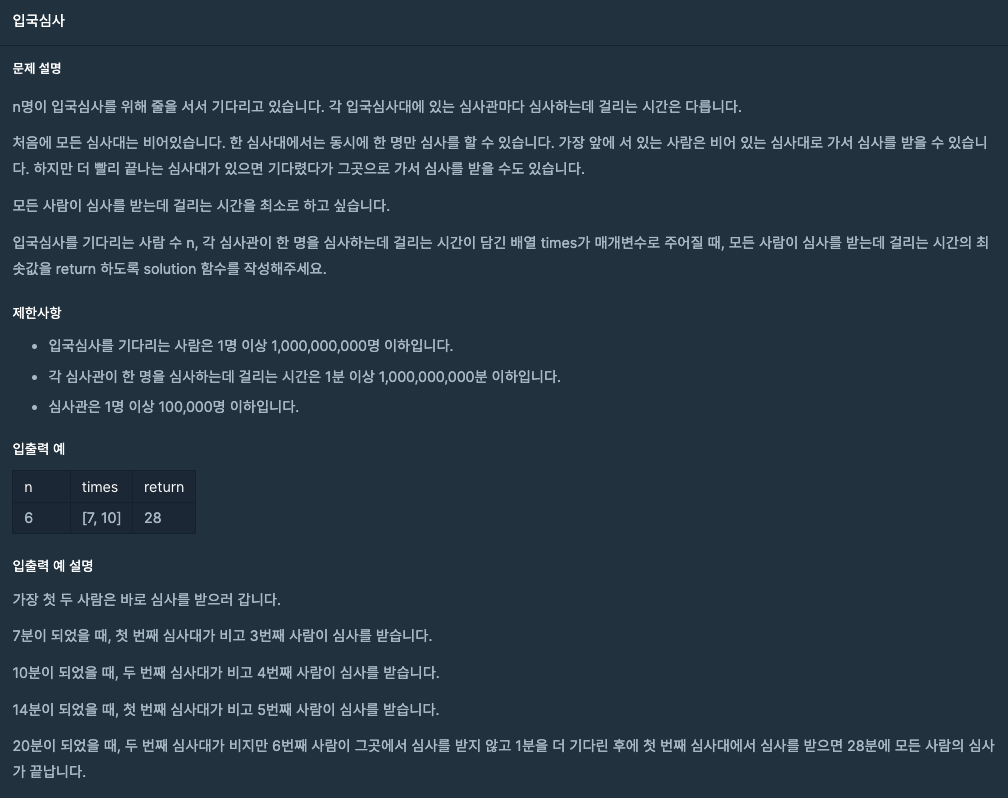 https://school.programmers.co.kr/learn/courses/30/lessons/43238 프로그래머스 코드 중심의 개발자 채용. 스택 기반의 포지션 매칭. 프로그래머스의 개발자 맞춤형 프로필을 등록하고, 나와 기술 궁합이 잘 맞는 기업들을 매칭 받으세요. programmers.co.kr def search(n, times, mid): cnt = 0 for t in times: cnt += mid // t return True if cnt >= n else False def solution(n, times): start = 0 end = min(times) * n mid = start while mid + 1 != end: mid = (start + end) // 2 if sear..