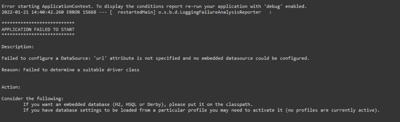 SpringBoot 프로젝트 생성 후 MyBatis 사용하고자 할 때 발생할 수 있는 오류입니다. 해당 오류는 pom.xml에 mybatis dependency를 작성하고 application.properties에 datasource로 데이터베이스 정보를 입력하지 않았기때문에 발생합니다. 해결 방법은 데이터베이스를 사용하지 않는다면 pom.xml에 mybatis dependency를 제거하거나, mybatis를 이용하여 데이터베이스를 사용한다면 application.properties에 데이터베이스 정보를 입력해주면 됩니다. (위 그림 3~10 라인 주석 해제)